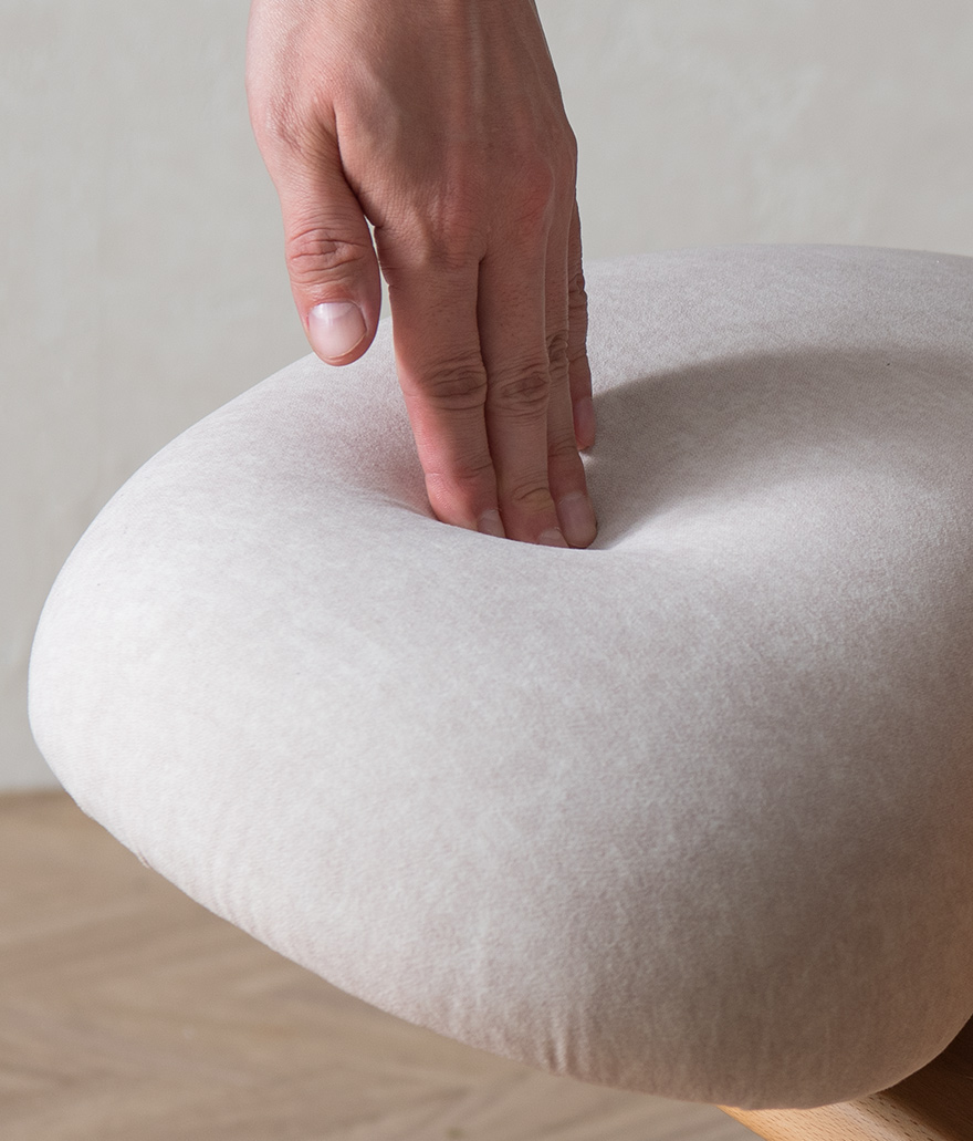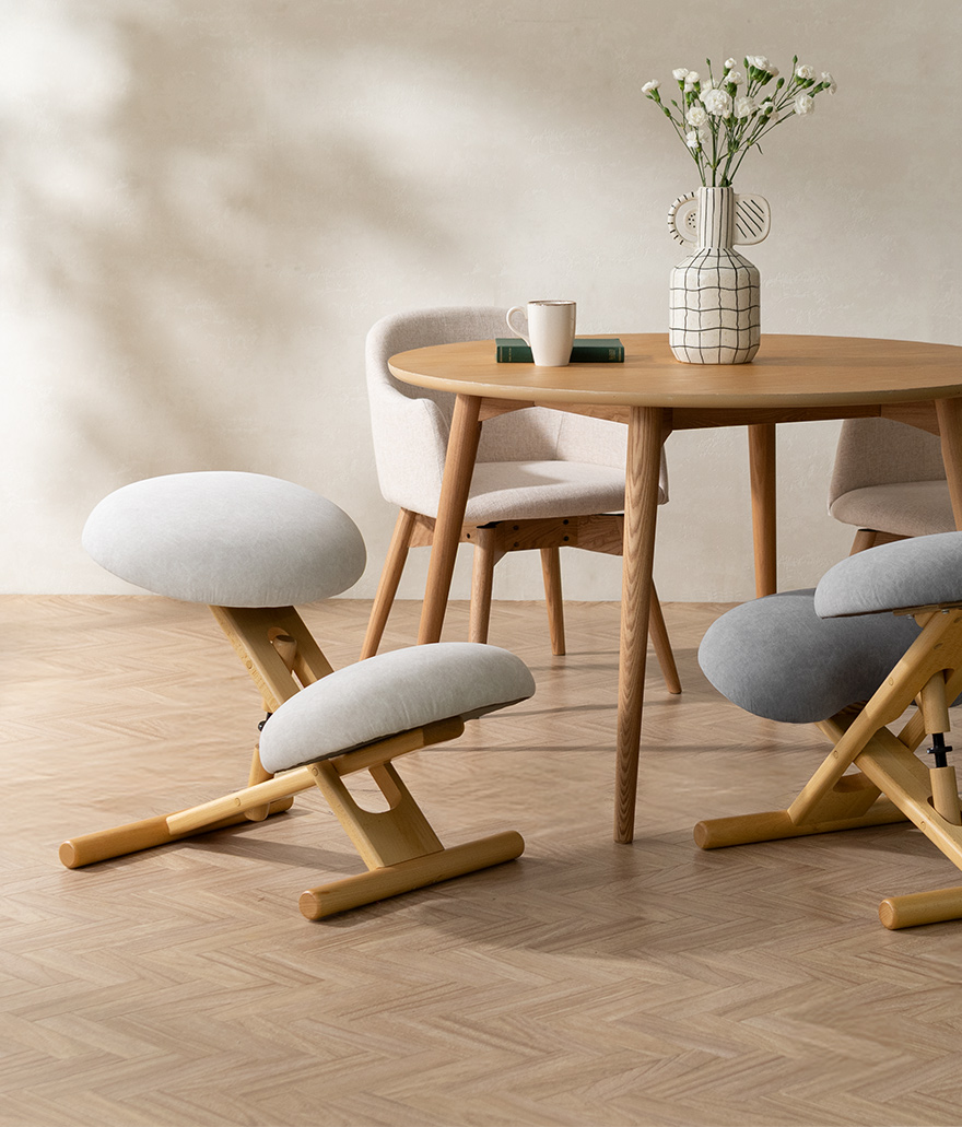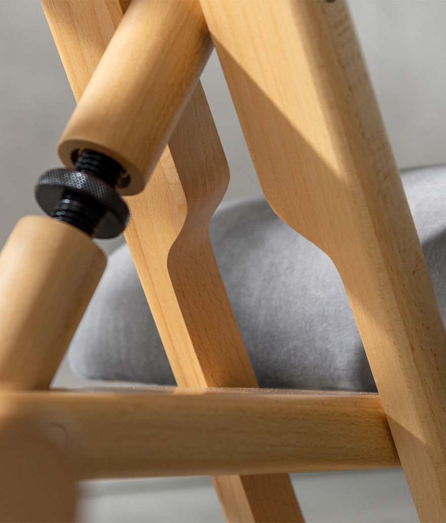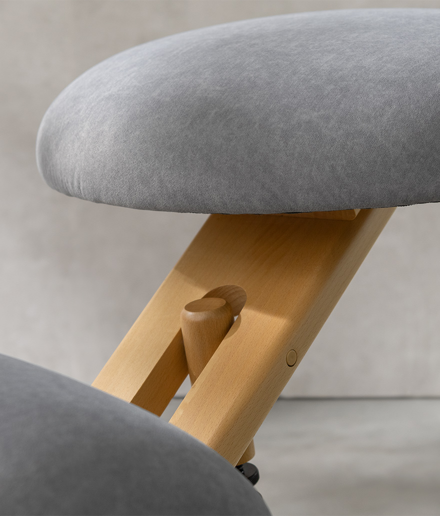 丸みを帯びたフォルムと、天然木の質感を活かしたシンプルで温かみのあるデザイン。 主張しすぎない佇まいで、リビングやダイニング、子ども部屋など、さまざまなインテリアに自然と馴染みます。 横幅45cmとコンパクトなサイズ感は学習机の下にもスッキリ収納できて、使わない時にも邪魔になりません。 アフターサービスも充実しており、パーツが摩耗してしまった場合でも、パーツ1つからご購入いただけます。